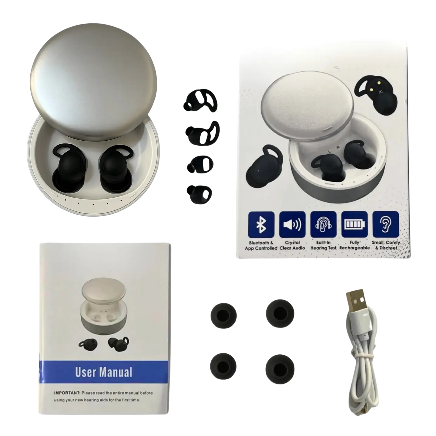 Twoja nowa para aparatów słuchowych z krystalicznie czystym dźwiękiem, wygodnym dopasowaniem, w pełni regulowanymi ustawieniami częstotliwości i trybami słuchania, 10-godzinnym czasem pracy akumulatora i regulacją głośności do 80 dB.